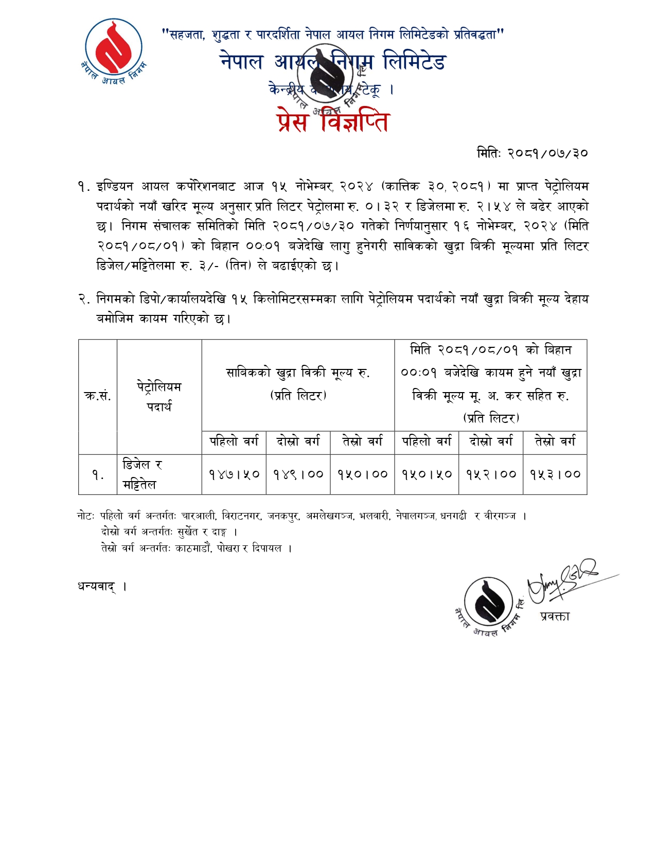 काठमाडौँ : नेपाल आयल निगमले डिजल र मट्टितेलको मूल्य बढाएको छ। पेट्रोलको मूल्य केही पैसा बढेर आए पनि हाललाई यथावत राखिएको निगमले जानकारी दिएको छ। बढेर आएको मूल्य आजै देखी लागू भएको छ। निगमले सार्वजनिक गरेको सूचना अनुसार डिजेल र मट्टितेलमा प्रतिलिटर ३ रुपैयाँ मूल्य बढाइएको छ।