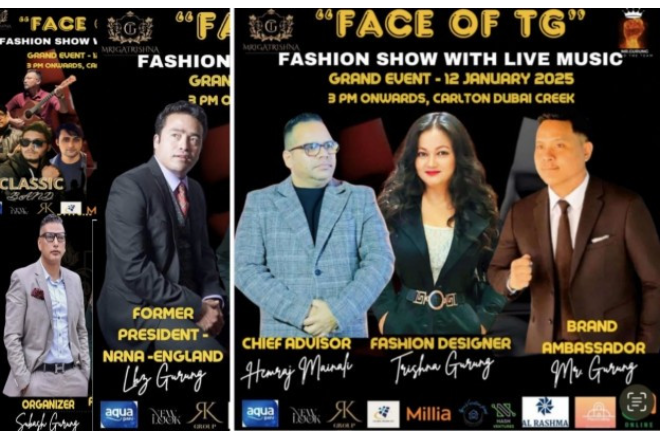 यूएईको दुबईमा आउँदो १२ जनवरी २०२५ मा पहिलो पटक नेपाली डिजाइनर तृष्णा गुरुङद्वारा डिजाइन गरिएका पहिरनमा चर्चित मोडलहरू र्याम्पमा प्रस्तुत हुने भएका छन।
