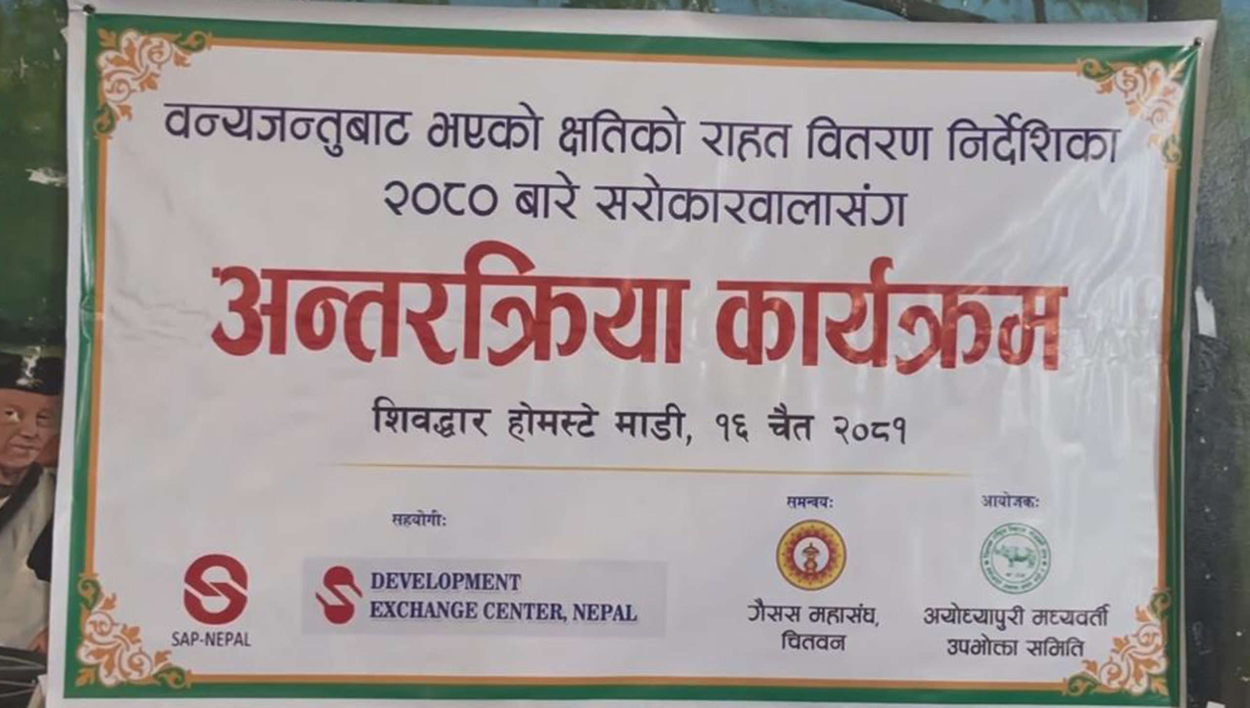 १६ चैत, माडी । चितवनको माडीमा आज वन्यजन्तुबाट भएको क्षतिको राहत वितरण निर्देशिका २०८० माथि अन्तरक्रिया गरिएको छ । अयोध्यापुरी मध्यवर्ती उपभोक्ता समितिको आयोजना, जिल्ला गैर सरकारी संस्था महासंघ चितवनको समन्वय, साप नेपाल र डेक नेपालको सहयोगमा गरिएको उक्त कार्यक्रममा वन्यजन्तु प्रभावित क्षेत्रका बासिन्दाहरुले नयाँ राहत निर्देशिका पीडितमैत्री नभएको औल्याएका छन् ।