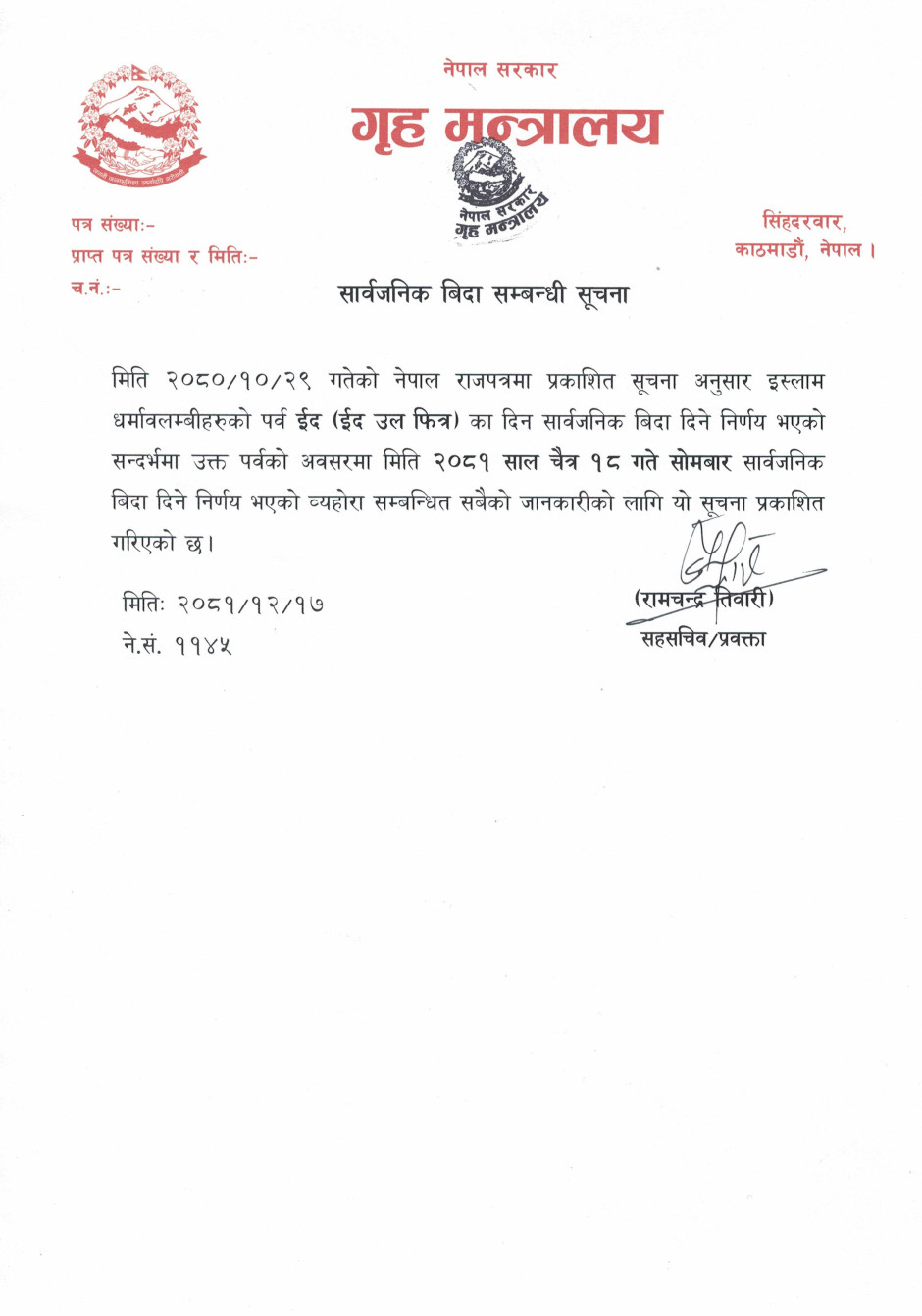 गृह मन्त्रालयले हिजो एक विज्ञप्ति जारी गरि सोमबार सार्वजनिक बिदा दिएको हो।
