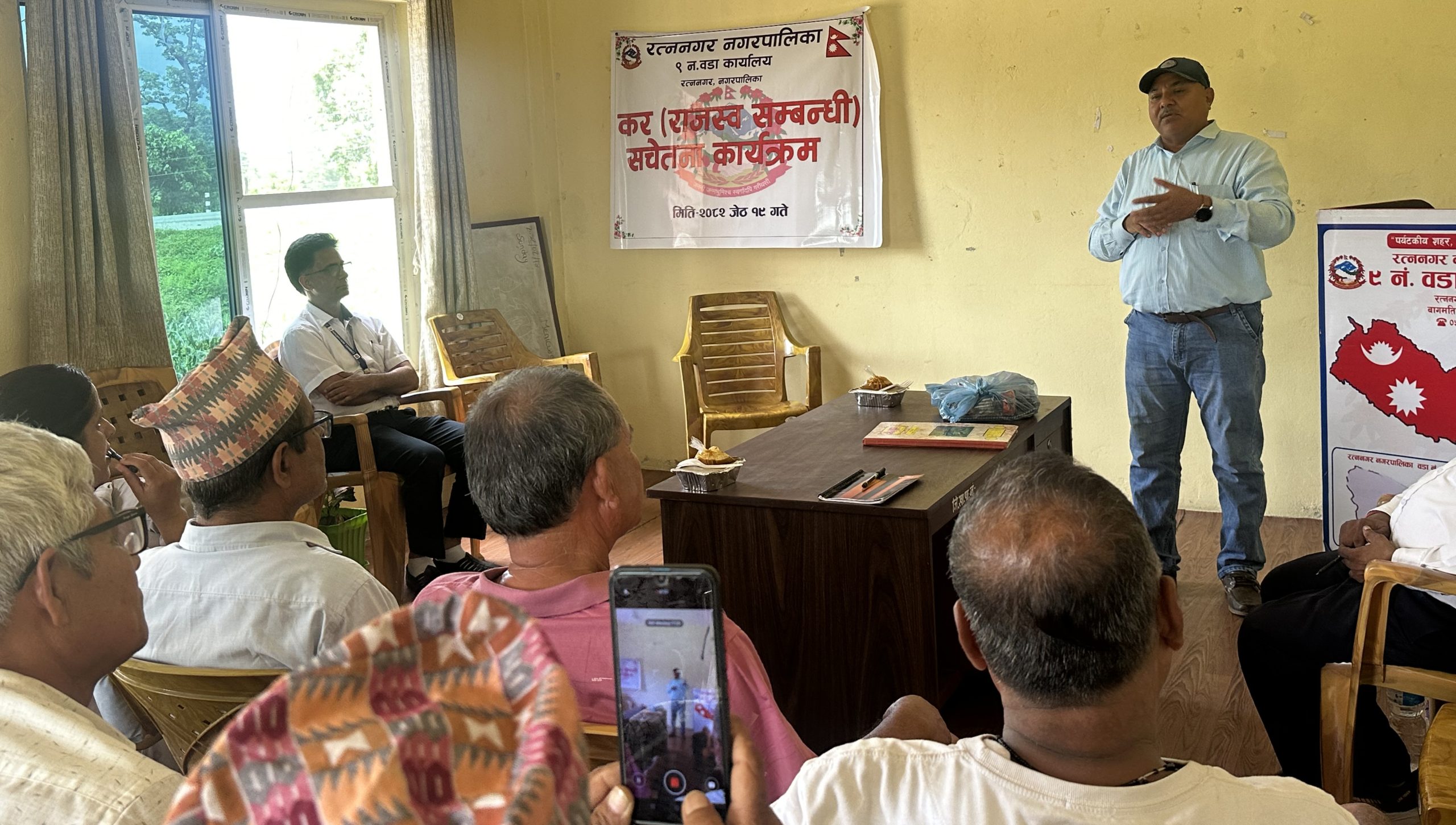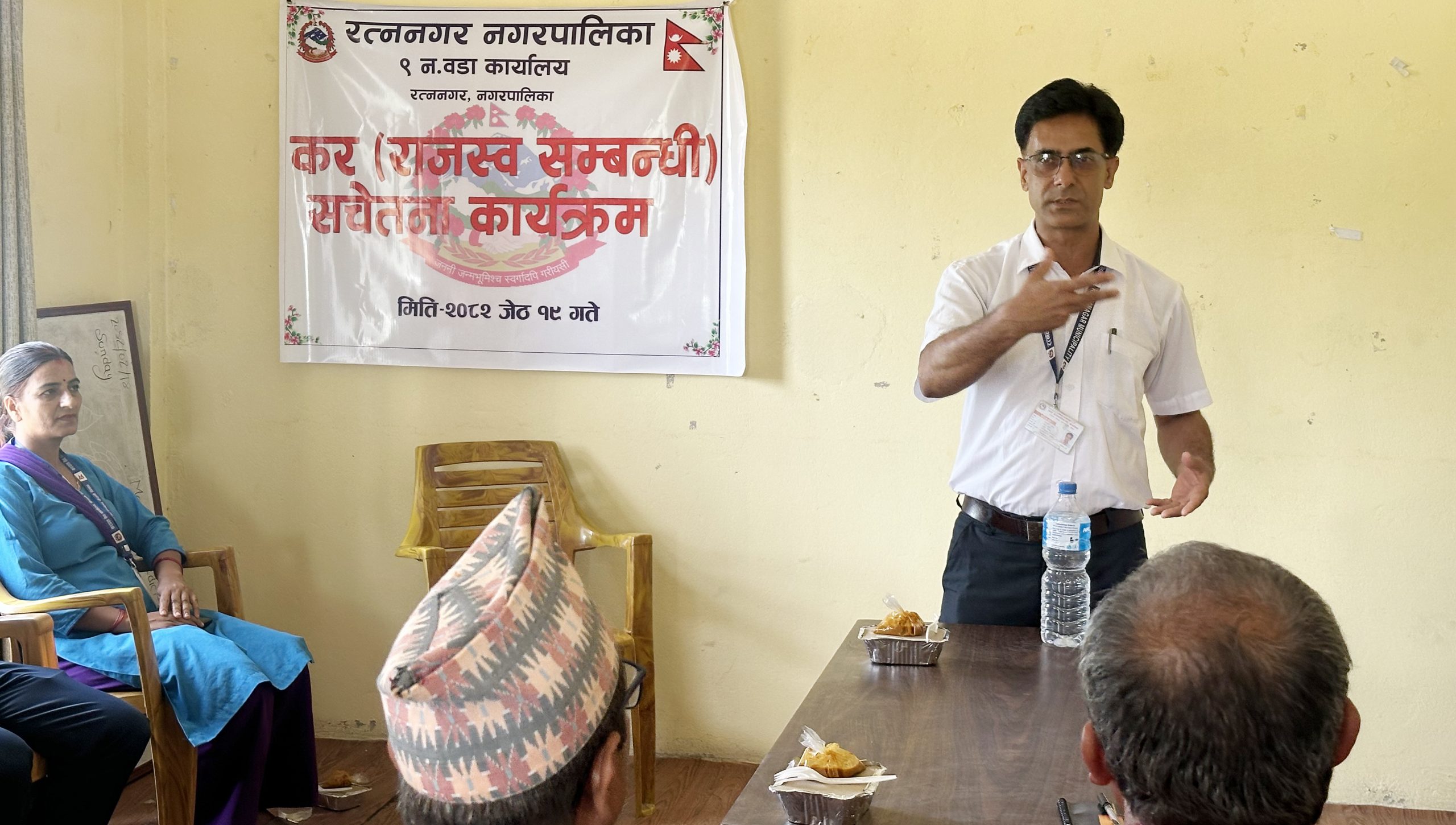 रत्ननगर ९ मा कर (राजश्व) सम्बन्धि सचेतना कार्यक्रम गरिएको छ । सचेतना कार्यक्रमलाई रत्ननगर नगरपालिकाको प्रमुख प्रशासकीय अधिकृत सुकदेव लम्साल, करदाता सेवा कार्यालय, खैरहनीका सुचना अधिकारी चन्द्र अर्याल, रत्ननगर नगरपालिकाका राजश्व शाखा प्रमुख लिलानाथ अर्यालले सहजीकरण गर्नुभएको थियो । कार्यक्रम मार्फत रत्ननगर नगरपालिकाका प्रमुख प्रशासकीय अधिकृत सुकदेव लम्सालले कर भनेको के हो ?, करका प्रकार, नगरपालिकाले कर लगाउन सक्ने कानुनी आधार, रत्ननगर राजपत्र, घरवहाल कर, नक्सापास, चारकिल्ला प्रमाणित, आयश्रोत कर, पर्यटन सेवा कर तथा सरसफाई कर लगायतका विषयमा सहजीकरण गर्नुभएको थियो ।