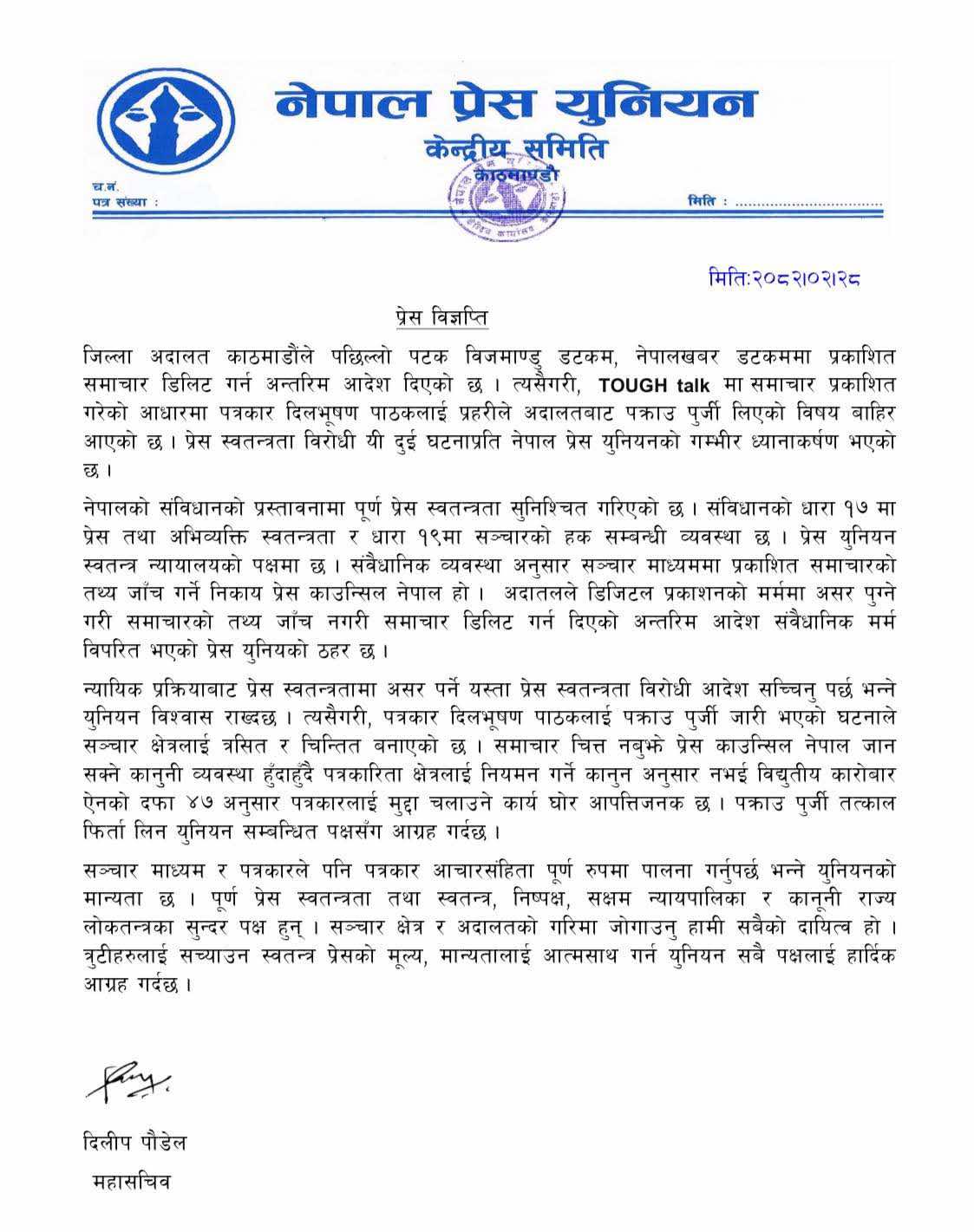 नेपाल प्रेस युनियनका महासचिव दिलीप पौडेलले आज एक विज्ञप्ति प्रकाशित गरी प्रेस युनियन स्वतन्त्र न्यायालयको पक्षमा रहेको स्मरण गराउँदै अदातलले डिजिटल प्रकाशनको मर्ममा असर पुग्ने गरी समाचारको तथ्य जाँच नगरी समाचार डिलिट गर्न दिएको अन्तरिम आदेश संवैधानिक मर्म विपरित भएको जनाएका छन् ।